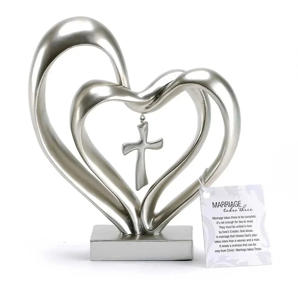 This tabletop decor accent represents unity through a simple, symbolic design. The entwined heart and cross form a meaningful visual that complements quiet spaces within the home. Designed to sit comfortably on shelves or tables, it serves as a thoughtful decorative reminder of connection and belief.